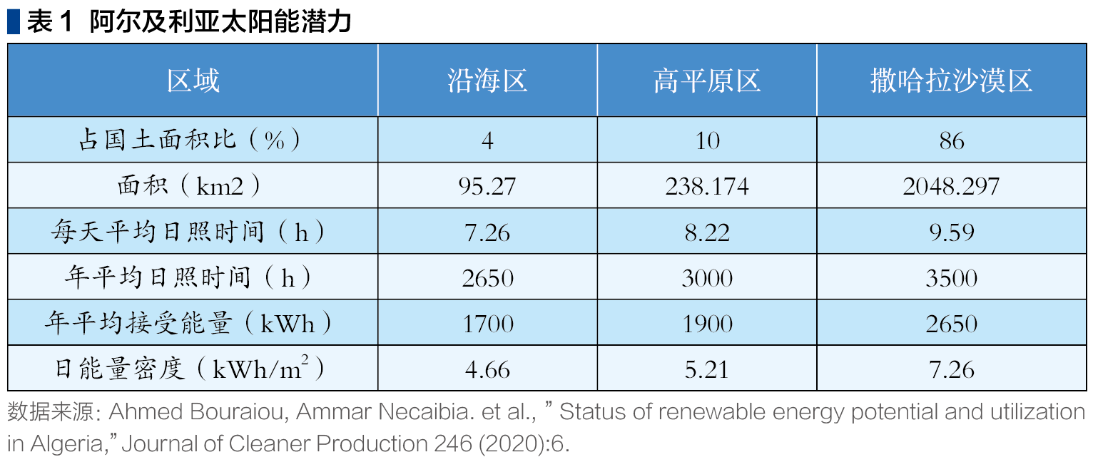 由于领土面积和天气多样性,阿尔及利亚具有很高的太阳能潜力,特别是在撒哈拉地区(南部地区)。阿尔及利亚使用太阳能的历史可以追溯到1954年,由法国为陶瓷制造而建造的太阳能炉。联合国环境规划署环境保护监测中心副主任卡维·扎赫迪(Kaveh Zahedi)说,阿尔及利亚撒哈拉沙漠的规模可以捕获足够的太阳能,以满足整个世界的电力需求。在全国大部分地区,1平方米水平面上每天获得能量为5kWh,北部每年约1700kWh/平方米,南部每年约2263kWh/平方米。适用于光伏(并网、村庄电气化、水泵)或集中式太阳能(CSP)等太阳能应用。(见表1)