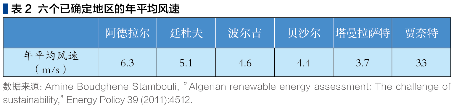 当平均风速大于5-6m/s时,我们就可以认为该地区存有较大的风能潜力。阿尔及利亚78%的领土显示风速高于3m/s,其中约40%的速度超过5m/s,南部地区风速比北部地区更快,超过6m/s。这使得阿尔及利亚拥有利用风能的优势,如风电场。国家电力公司Sonelgaz对风能资源进行量化评估,分别在阿德拉尔(Adrar)、廷杜夫(Tindouf)、波尔吉(Bordj Badji Mokhtar)、贝沙尔(Bechar)、塔曼拉萨特(Tamanrassat)和贾奈特(Djanet)地区。从评估结果来看,阿德拉尔地区接收到的风最多。(见表2)
