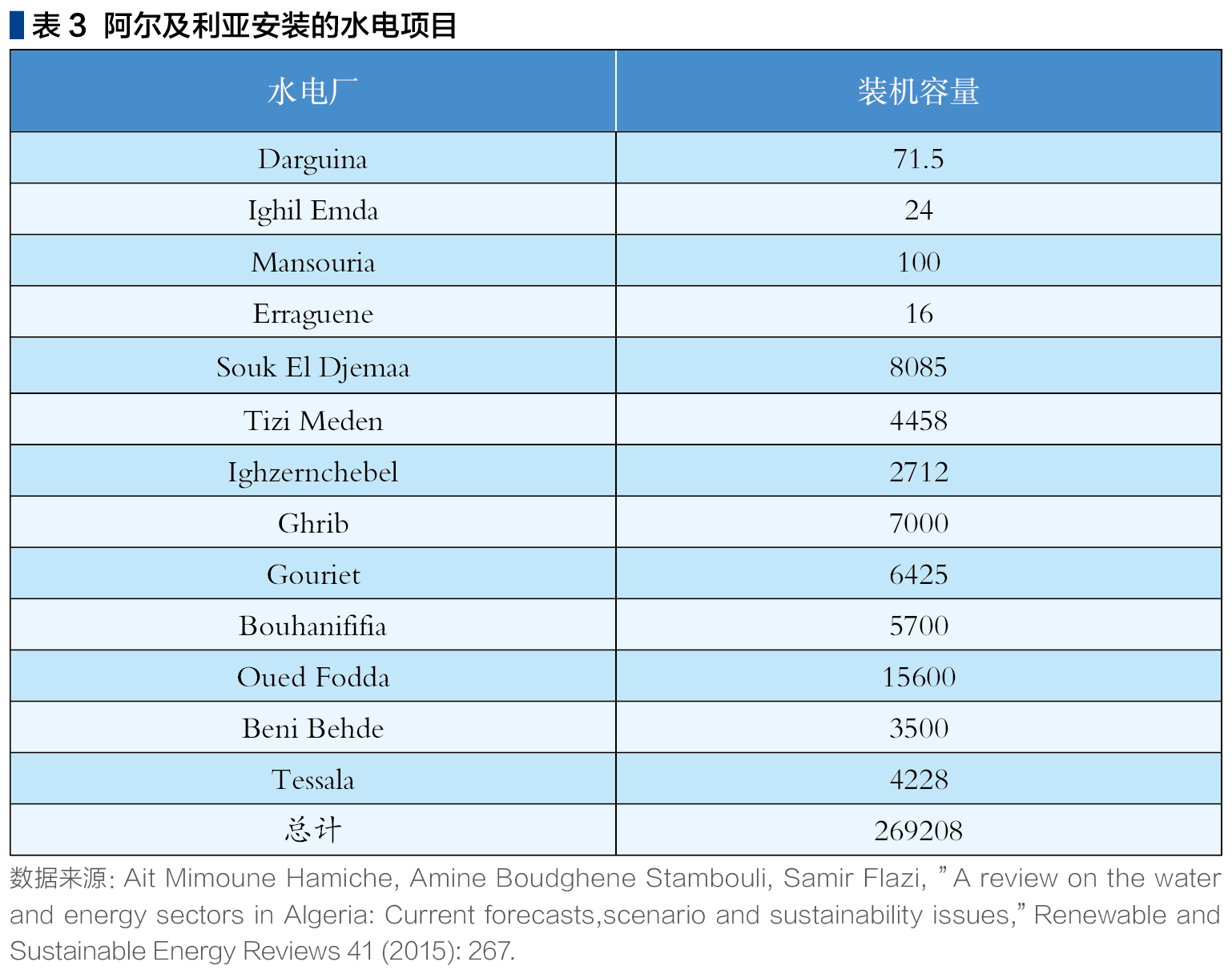 阿尔及利亚地下水资源丰富,但地表水资源紧缺。阿尔及利亚境内总的降雨水流量估计为650亿平方米,其中约2/3为地表资源。由于降雨天数有限,且集中在一定地区,高蒸发和快速流入,及政府缺乏对现有103个坝址的开发等因素,该国进行水力发电的效益很低,预计总装机容量为270MW。(见表3)