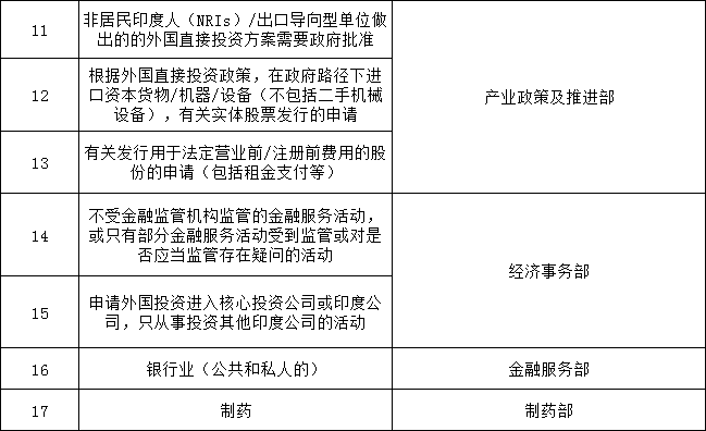 (2)相对限制领域,即对于外资持股比例有限制、必须与印度企业合资或者按照政府路径才能进入的领域。
