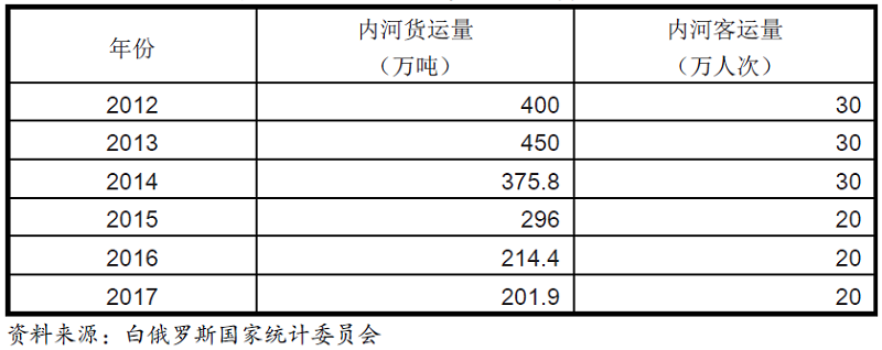 白俄罗斯内河水运网长约2000公里,通过10个河港将旅客和货物运到沿河各居民点和货物加工点。这10个河港位于普里皮亚季河、第聂伯河、索日河、别列津纳河、涅曼河、西德维纳河流域。欧洲水系中的水路布格河—第聂伯布格运河—普里皮亚季河—第聂伯河—黑海出海口水系流经白俄罗斯,白俄罗斯沿着这条水路交通干线出口钾肥。戈梅利、博布鲁伊斯克和莫济里的河港都有铁路专用线并且适合对需要联运的货物进行整理。港口装备有高效的龙门起重船和快速编组船舶的机械化货运线。2017年,内河货运量201.9万吨,同比减少5.83%。