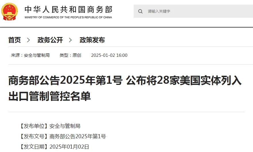 北京时间 1 月 2 日 16 点,中国商务部发布 2025 年第 1 号文件,宣布将 28 家美国实体列入出口管制管控名单